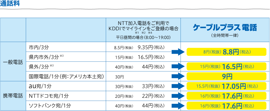 ※1:発信番号表示の契約が必要です。また、利用にあたり利用開始の設定が必要です。詳しくは後日お送りする「ケーブルプラス電話 ご利用ガイド」をご確認ください。 ※2:割込通話・発信番号表示の契約が必要です。 ※3:申込後、転送先電話番号・転送パターンの設定が必要です。詳しくは後日お送りする「ケーブルプラス電話 ご利用ガイド」をご確認ください。 ※4:申込後、着信通知先に登録したau携帯電話から利用開始の設定が必要です。詳しくは後日お送りする「ケーブルプラス電話 ご利用ガイド」をご確認ください。なお、一部の機種では本サービスはご利用いただけません。